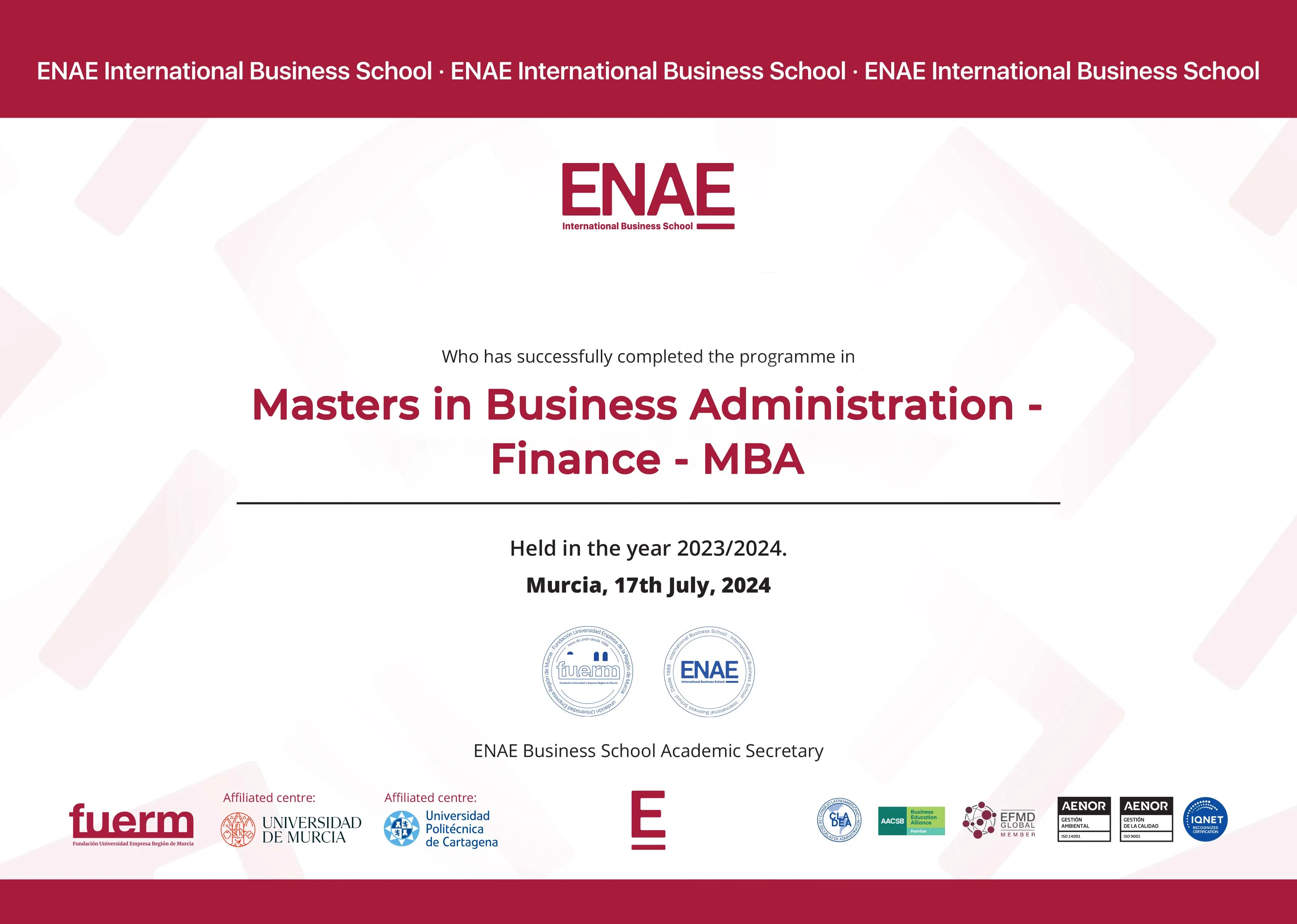 ENAE Business School is a private, for-profit teaching university in Spain. It offers a variety of undergraduate and postgraduate programs with both blended and online distance learning delivery options. Its head office is in Murcia, Spain and is ranked #35 in QS International Trade Ranking - Masters and MBA 2024.