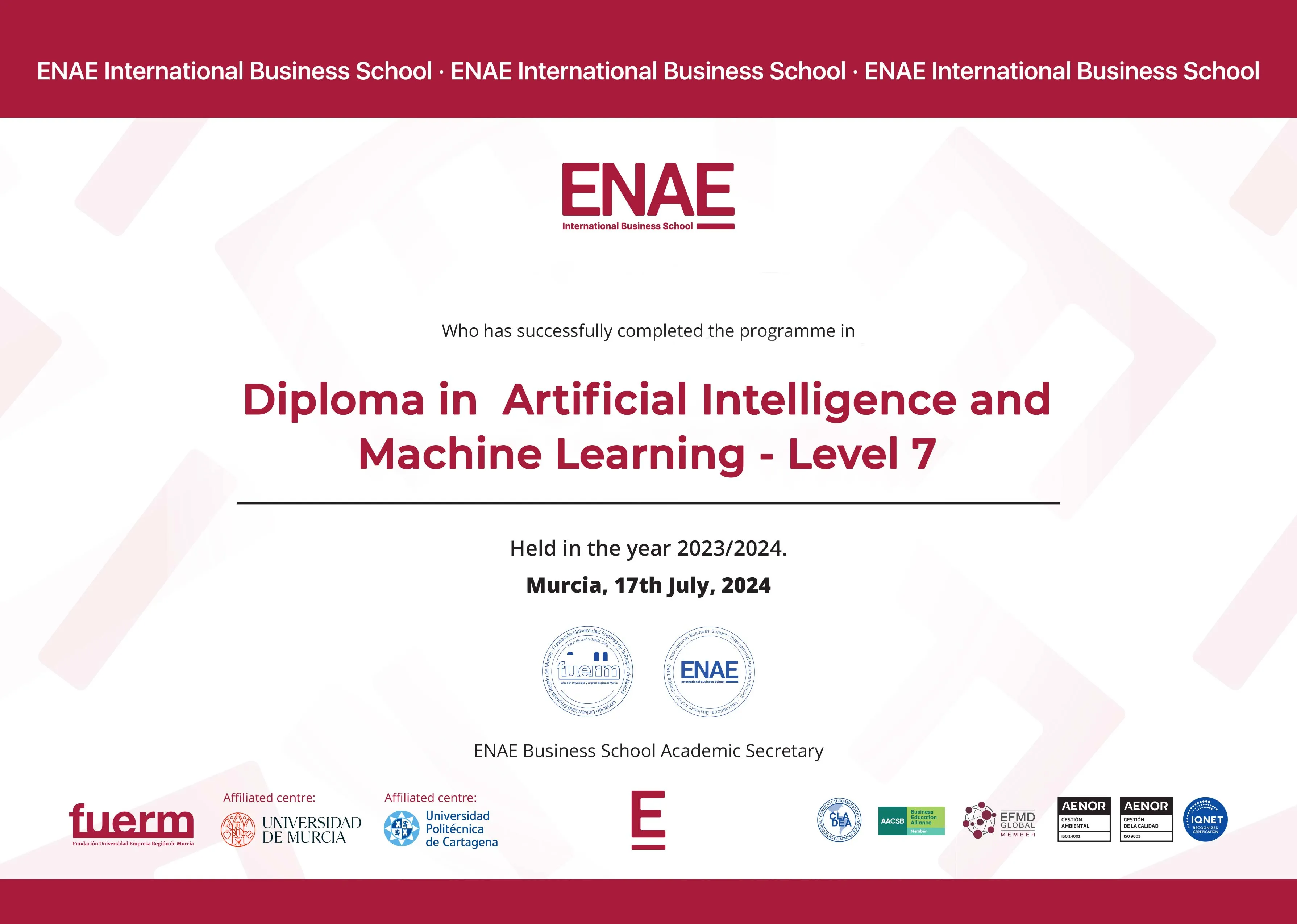 ENAE Business School is a private, for-profit teaching university in Spain. It offers a variety of undergraduate and postgraduate programs with both blended and online distance learning delivery options. Its head office is in Murcia, Spain and is ranked #35 in QS International Trade Ranking - Masters and MBA 2024. SNATIKA learners are awarded MBA, MSc, MA, BSc, and BA degrees from ENAE Business School.