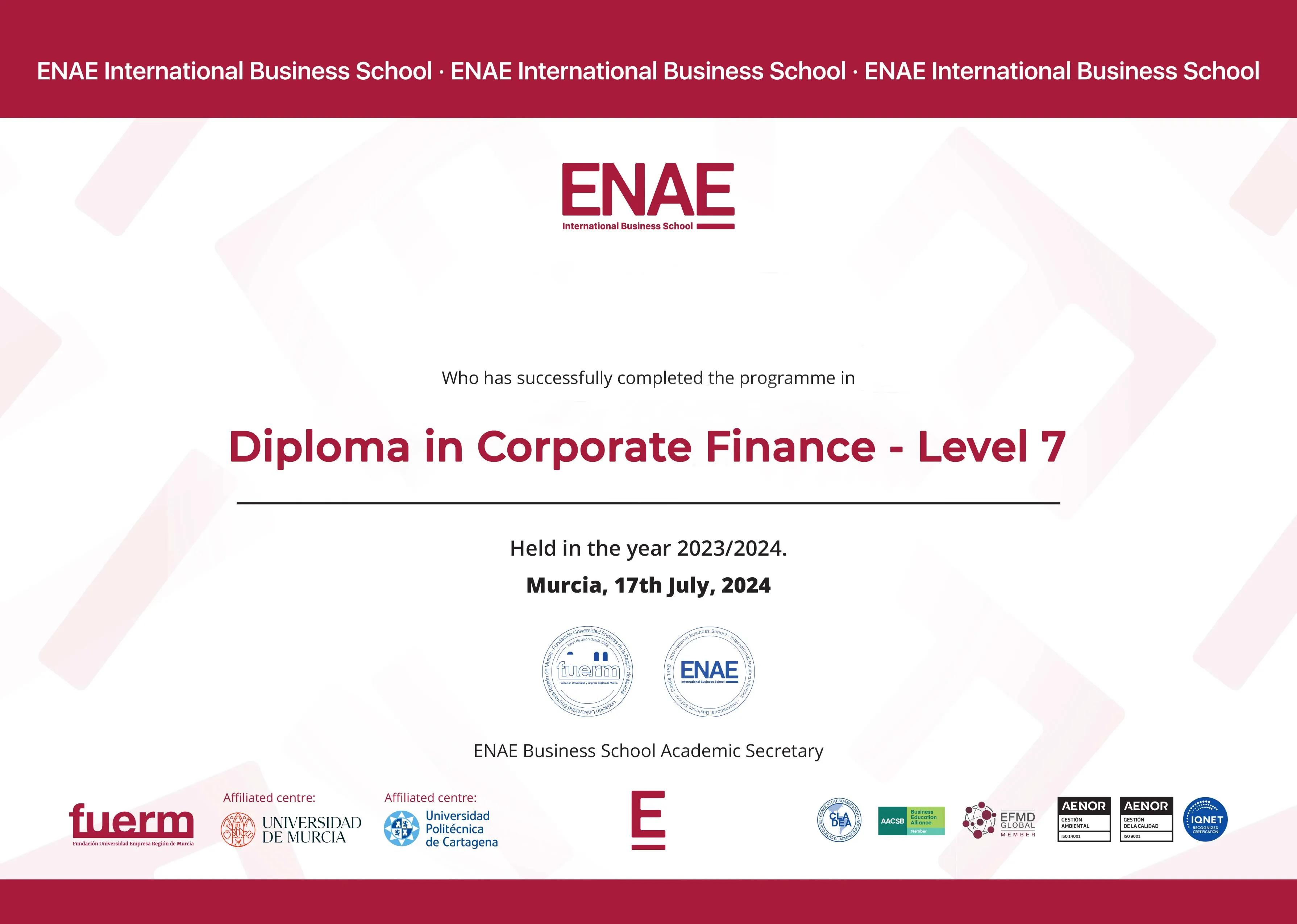 ENAE Business School is a private, for-profit teaching university in Spain. It offers a variety of undergraduate and postgraduate programs with both blended and online distance learning delivery options. Its head office is in Murcia, Spain and is ranked #35 in QS International Trade Ranking - Masters and MBA 2024. SNATIKA learners are awarded MBA, MSc, MA, BSc, and BA degrees from ENAE Business School.