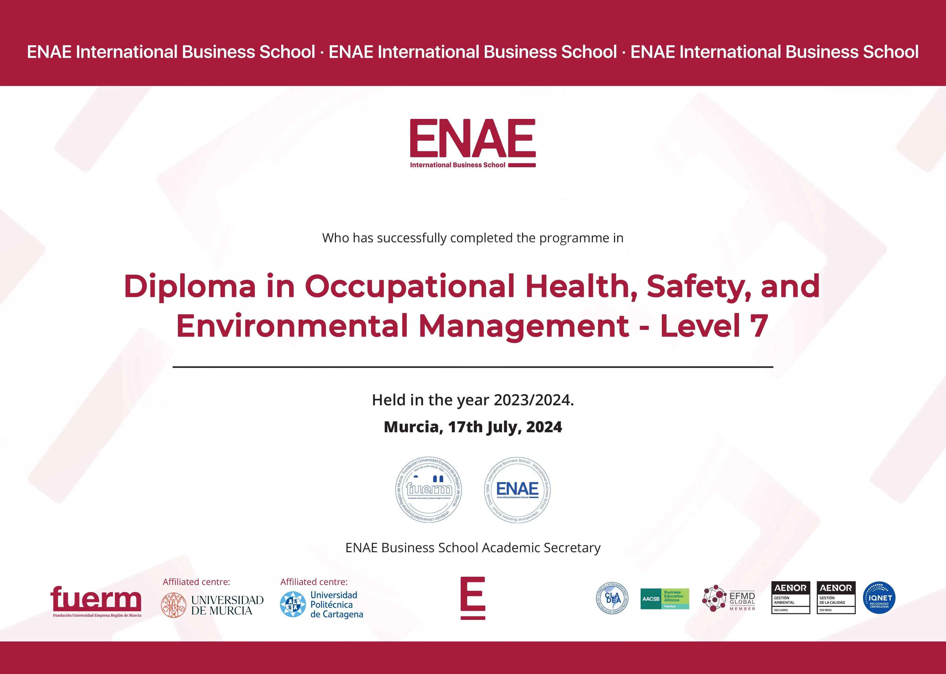 ENAE Business School is a private, for-profit teaching university in Spain. It offers a variety of undergraduate and postgraduate programs with both blended and online distance learning delivery options. Its head office is in Murcia, Spain and is ranked #35 in QS International Trade Ranking - Masters and MBA 2024. SNATIKA learners are awarded MBA, MSc, MA, BSc, and BA degrees from ENAE Business School.