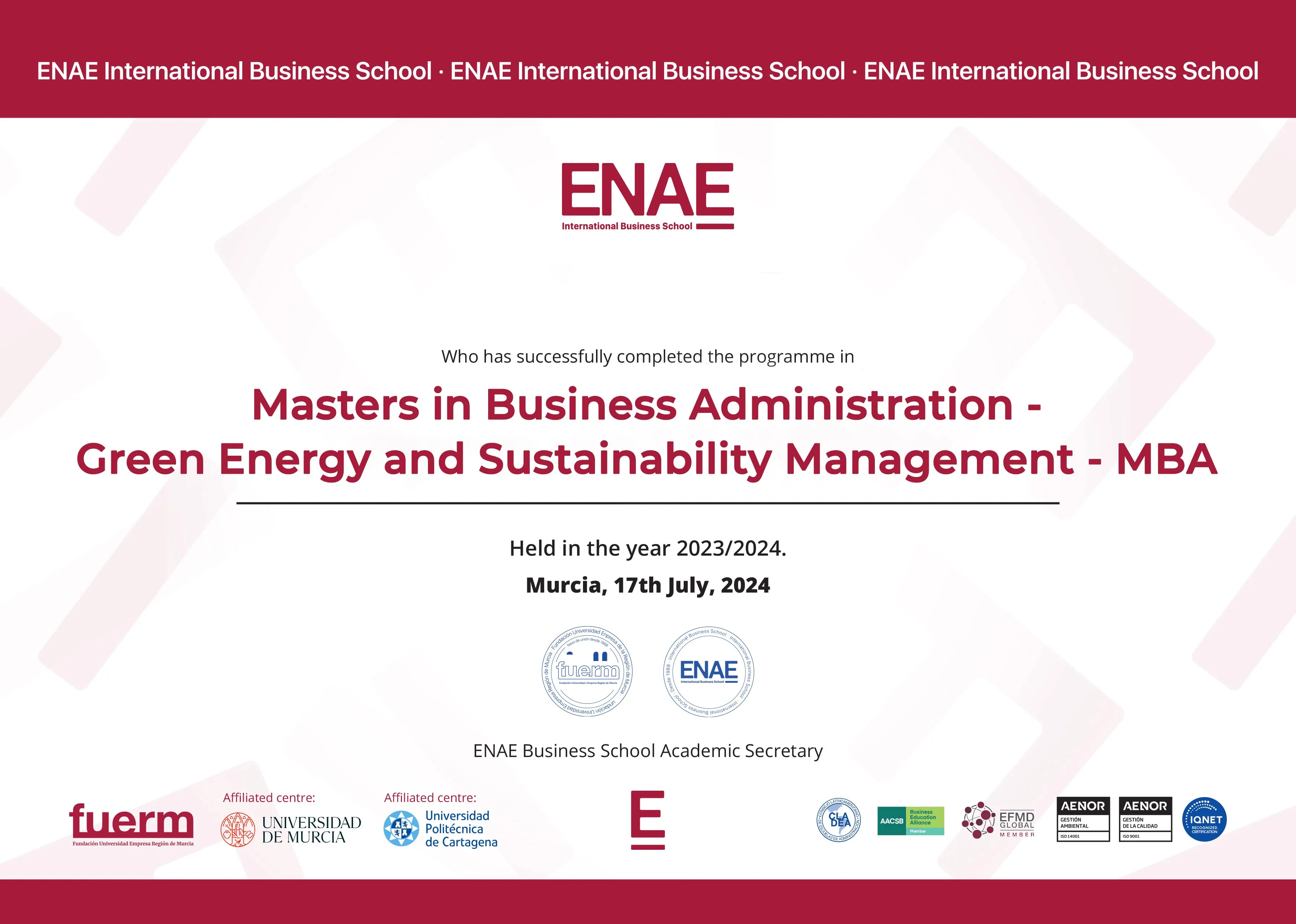 ENAE Business School is a private, for-profit teaching university in Spain. It offers a variety of undergraduate and postgraduate programs with both blended and online distance learning delivery options. Its head office is in Murcia, Spain and is ranked #35 in QS International Trade Ranking - Masters and MBA 2024. SNATIKA learners are awarded MBA, MSc, MA, BSc, and BA degrees from ENAE Business School.