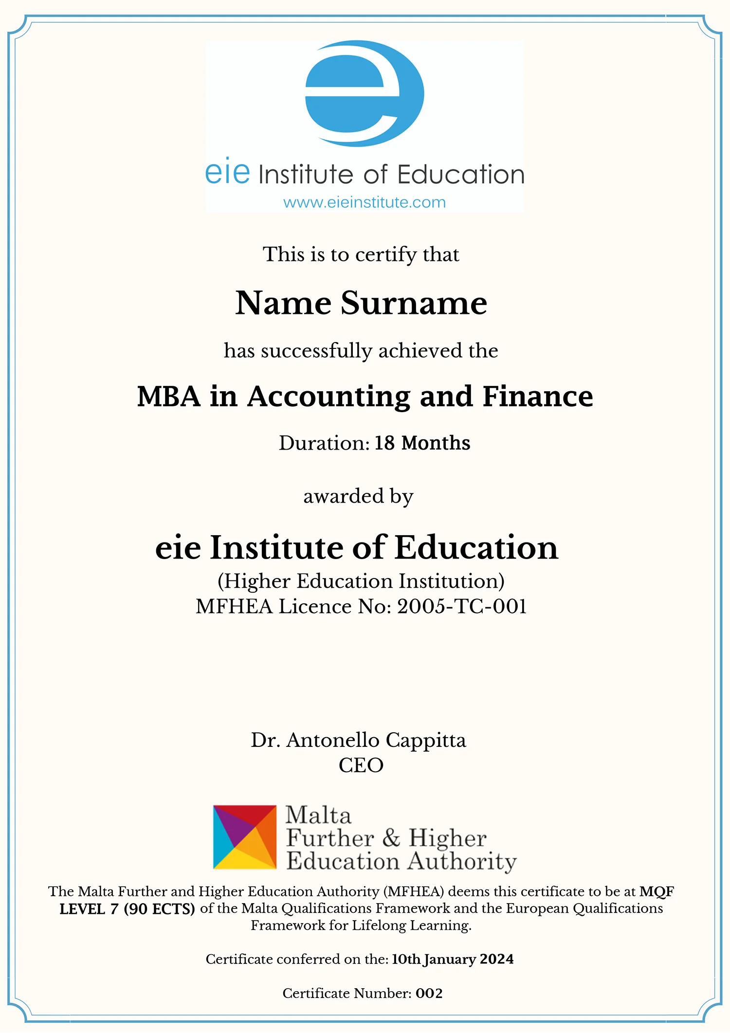 The European Institute of Education is a Higher Education Institution established in 2000 in Malta, European Union. It is licensed by the Malta Further & Higher Education Authority (Licence No: 2005-TC-001). eie offers qualifications (EQF Levels 5-7) which blend with the flexibility and versatility that most people require in their busy lives.