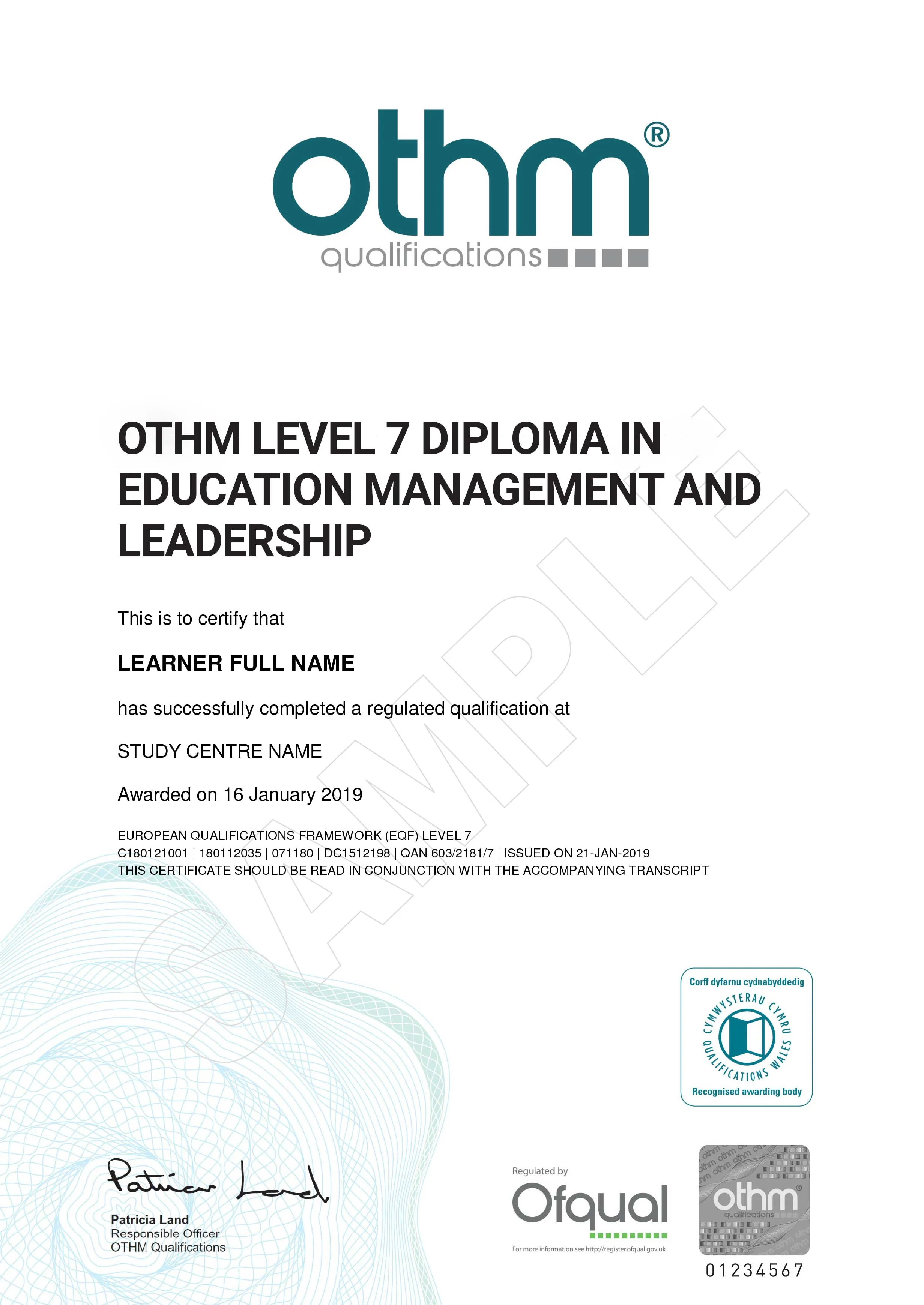 OTHM is approved and regulated by Ofqual (Office of the Qualifications and Examinations Regulation). The Register of Regulated Qualifications Framework can be found at https://register.ofqual.gov.uk . OTHM is an awarding body and not a university. OTHM only awards diplomas, not degrees.